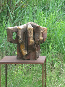 Takken worden armen, zowel reikend naar de hemel als afwerend en beschermend. Gesculpteerd uit kersenhout met kettingzaag, slijp- en schuurschijven op een metalen sokkel.