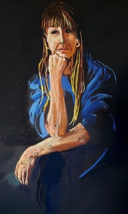 Portret in blauw potlood van een treurende vrouw, groot formaat